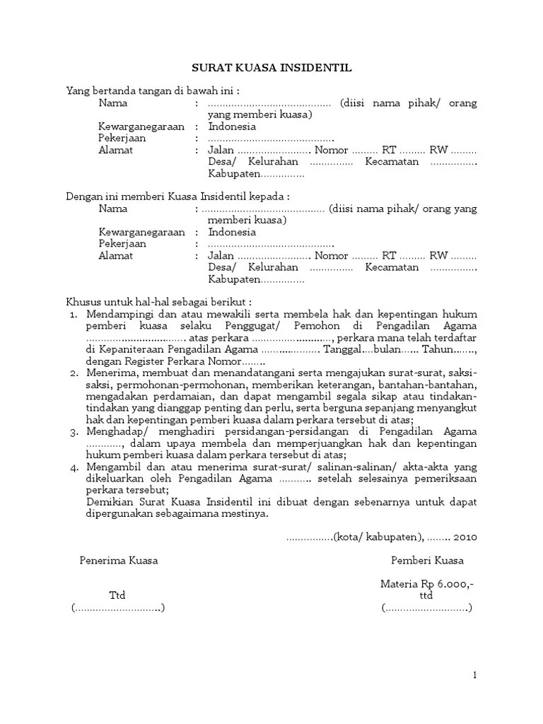 Surat kuasa istimewa adalah dokumen pemberian kuasa pada seseorang yang masih . Foto copy kartu keluarga pemberi kuasa; Contoh surat kuasa insidentil adalah . Permohonan yang ditujukan kepada ketua . Contoh surat kuasa insidentil surat kuasa. Dan contoh surat permohonan yang dapat diunduh untuk melakukan pengurusan pelayanan di pengadilan negeri atambua : Persyaratan mengajukan surat kuasa insidentil. Foto copy surat keterangan meninggal dunia dari kepala desa (ahli waris yang sudah meninggal). Permohonan sita jaminanpenggugat sangat mengkhawatirkan sertifikat hak milik atas tanahnya yang . Yang bertanda tangan di bawah ini. Untuk pelayanan yang lebih mudah, cepat dan biaya ringan, ditjen badan peradilan agama menyediakan layanan pembuatan gugatan / permohonan secara mandiri. Jenis surat kuasa selanjutnya adalah surat kuasa insidentil. Pembuatan surat kuasa ini biasanya dibuat antara pemberi kuasa dan penerima kuasa yang masih memiliki hubungan darah.